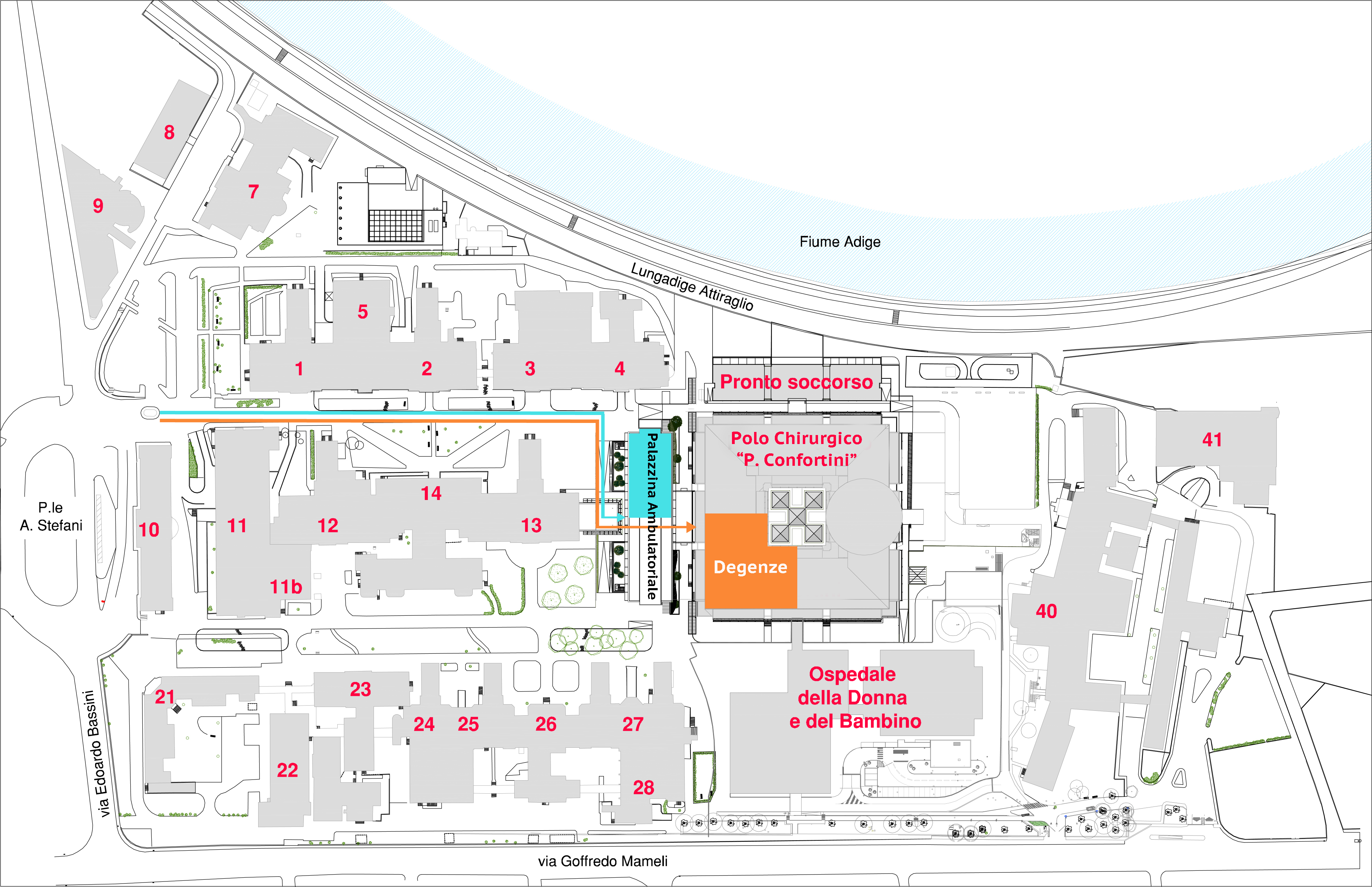 Ambulatori: Pad. 15 (Polo Confortini), lato Adige, Piano 1° per visite ambulatoriali ; Pad. 15 (Polo Confortini), lato Mameli, Piano 3° per medicazioni ed esami preoperatori
